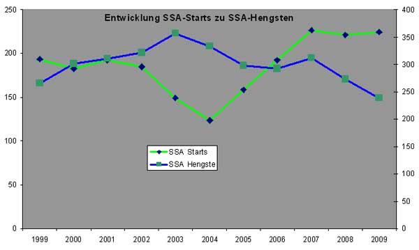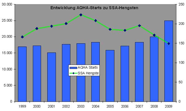 Eien Entwicklung, von der das DQHA Zuchtprogramm überhaupt nicht profitieren konnte: Die Zahl der einbezahlten DQHA SSA-Hengste sank seit 2005 um 20% (siehe Graphik), die DQHA-Futuritystarts stiegen lediglich um acht Starts.